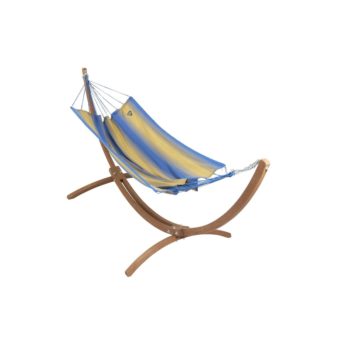 Ce modèle sans barre en bois offre une expérience unique : en l'absence de stabilisateur, le hamac se referme naturellement autour de vous créant une agréable sensation de cocon.