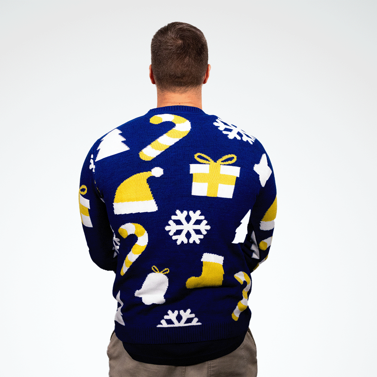 Affichez l’esprit des fêtes avec notre pull de Noël bleu marine, spécialement pensé pour allier confort, chaleur et élégance. Il reprend les motifs iconiques de la collection : flocons de neige, bottes de Noël, cadeaux et détails festifs en bleu, jaune et blanc, ainsi que le logo du club sur le torse.