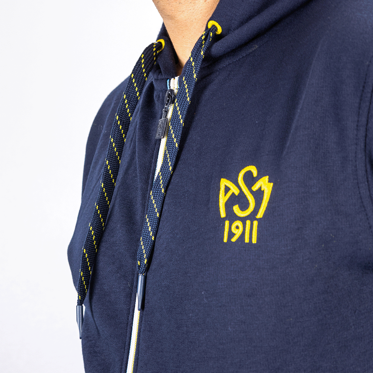 Ce sweat zippé coloris marine est un indispensable pour tous les supporters clermontois. Confortable et pratique grâce à sa capuche et sa fermeture zippée intégrale, il est parfait pour accompagner toutes vos sorties, au stade comme en ville.